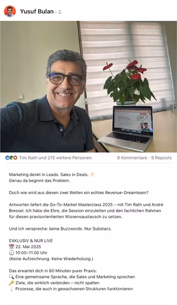 We used a rolling optimization model: launch quickly, learn fast, and apply insights to the next cycle. Targeting was tailored to each webinar, focusing on German-speaking marketers, sales leads, and GTM decision-makers.